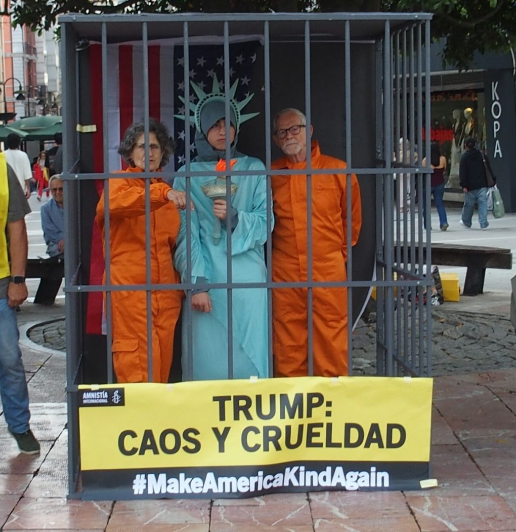 Antes del verano, el grupo de activismo volvió a tomar el espacio público para “celebrar” un 4 de julio marcado por la denuncia, fue en Oviedo. La acción puso el foco en la intolerancia y en las medidas adoptadas desde el inicio del segundo mandato de Donald Trump, representando simbólicamente el encarcelamiento de la Estatua de la Libertad.
