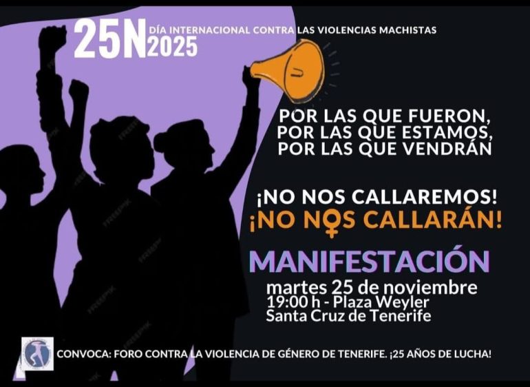 25/11/2025 @ 7:00 pm – Los compañeros de Tenerife estarán en la manifestación del 25 de noviembre por el día internacional contra la violencia machista. El comienzo de la manifestación será a las 19:00 en la Plaza Weyler. Convocada por el foro contra la violencia de género de Tenerife ¡25 años de lucha!