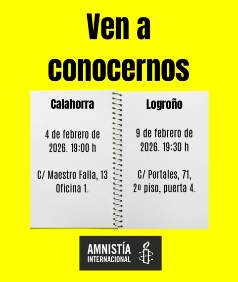 Si quieres colaborar con Amnistía Internacional La Rioja, en sus grupos de personas voluntarias en Logroño y Calahorra, o si simplemente quieres conocernos un poco más, acércate a nuestras próximas reuniones de bienvenida y puertas abiertas.
