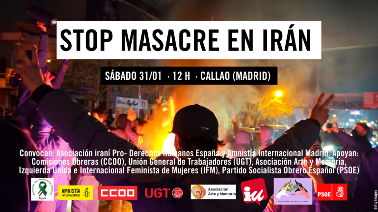 El sábado 31 de enero te esperamos a las 12:00h en la Plaza de Callao para gritar fuerte STOP a la masacre en Irán